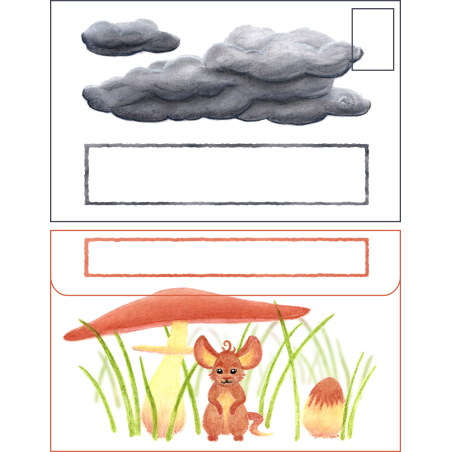 Une enveloppe colorée ornée d'une souris attendant la pluie sous un champignon, assez grande pour envoyer plein d'affection aux gens que vous aimez 💚 !