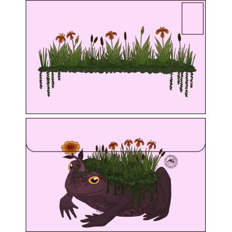 Une enveloppe colorée ornée d'un crapaud violet couvert de plantes en fleurs, assez grande pour envoyer plein d'affection aux gens que vous aimez 💚 !