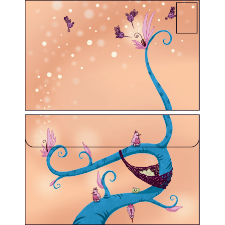 Une enveloppe colorée ornée d'un arbre bleu en fleurs et de la vie qui y a élu domicile, assez grande pour envoyer plein d'affection aux gens que vous aimez 💚 !