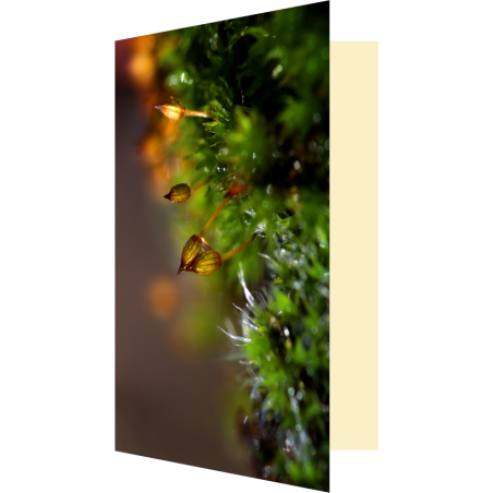 Une carte colorée ornée de mousse dont deux excroissances collées ensemble par une goutte d'eau semblent se faire un câlin, avec plein de place à l'intérieur pour écrire aux gens que vous aimez 💚 !