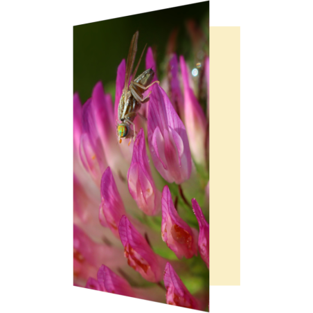 Une carte colorée ornée d'une jolie mouche aux yeux très colorés posée sur un trèfle des prés, avec plein de place à l'intérieur pour écrire aux gens que vous aimez 💚 !