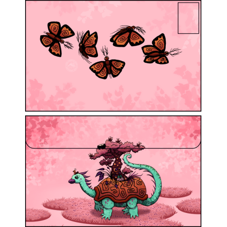 Une enveloppe colorée ornée d'une étrange tortue voyageuse et de tous les êtres-vivants qui l'accompagnent, assez grande pour envoyer plein d'affection aux gens que vous aimez 💚 !