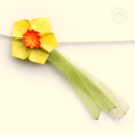 Celle-ci est décorée de rubans d'organza verts, ainsi que d'une jonquille jaune au cœur orange vif en origami, en papier plié, coloré à l'aide de marqueurs à l'alcool, et verni avec un vernis colle mat, le tout par mes soins.