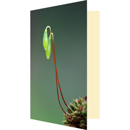 Une carte colorée ornée de mousse et de ses sporogones (des structures d'où sont produites les spores) à l'allure de minuscules lanternes naturelles, avec plein de place à l'intérieur pour écrire aux gens que vous aimez 💚 !