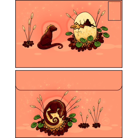 Une enveloppe colorée ornée d'une drôle d'association entre petits reptiles et grands oiseaux, qui s'entraident en fonction de leur capacités et de leur stade de vie, assez grande pour envoyer plein d'affection aux gens que vous aimez 💚 !