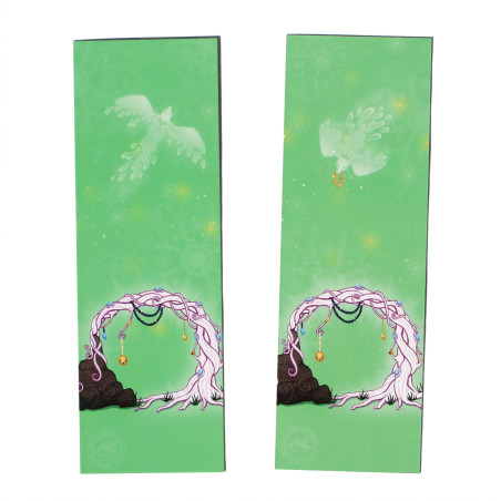 Le marque page comporte une partie différente de l'illustration sur le recto et sur le verso. Le recto est glacé, le verso est demi-mat.