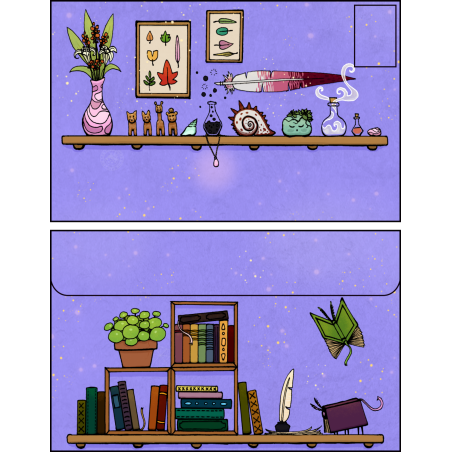Une enveloppe colorée ornée d'étagères couvertes d'un bric-à-brac hétéroclite peuplé de formes de vie étonnantes, assez grande pour envoyer plein d'affection aux gens que vous aimez 💚 !