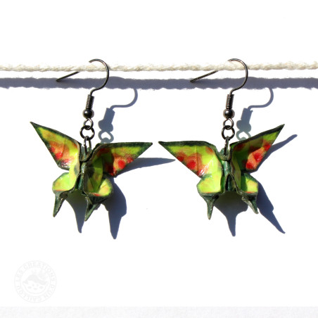 Une paire de boucles d'oreilles ornées de papillons verts et roses en origami, pliés, colorés, et vernis à la main