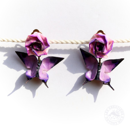Des clips d'oreilles ornés de roses et de papillons violets en origami, pliés, colorés, et vernis à la main.