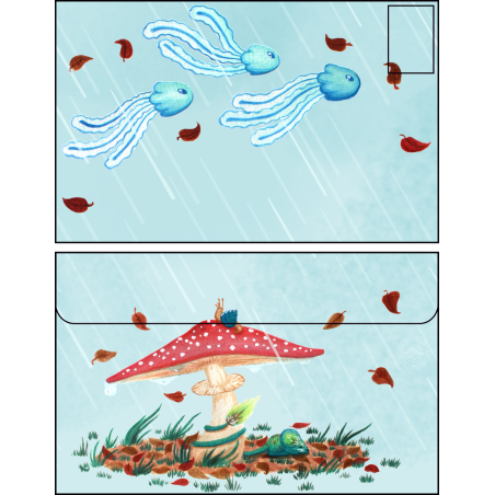 Une enveloppe colorée ornée d'un champignon sous la pluie et de toute les petites bêtes qui s'adaptent à ce déluge à leur manière, assez grande pour envoyer plein d'affection aux gens que vous aimez 💚 !