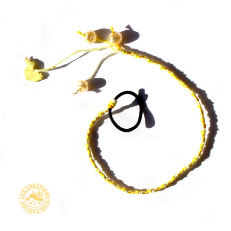 Atéba amovible ornée de perles et d'un poussin en origami plié, coloré et verni à la main.