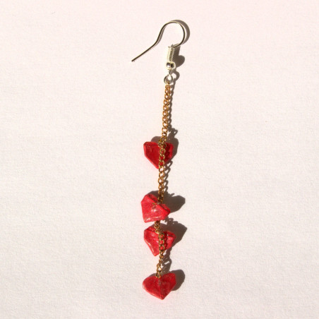 Une unique boucle d'oreille constituée d'une chaînette ornées de cœurs en origami, pliés et vernis à la main.