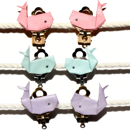 Des clips d'oreilles ornés de baleines en origami, pliées, éventuellement colorées, et vernies à la main.