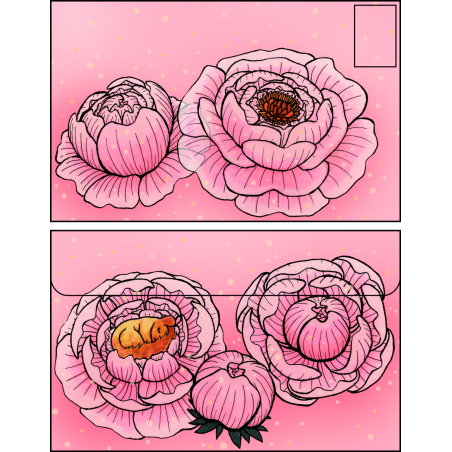 Une enveloppe colorée ornée de fleurs de pivoine rose translucides dans lesquelles une adorable bestiole s'est endormie, assez grande pour envoyer plein d'affection aux gens que vous aimez 💚 !