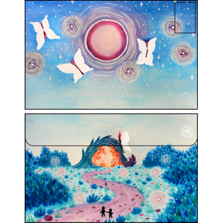 Une enveloppe colorée ornée d'un chemin à l'aube, menant à un portail vers un endroit et un temps autres, entouré de verdure et de drôles de créatures, assez grande pour envoyer plein d'affection aux gens que vous aimez 💚 !