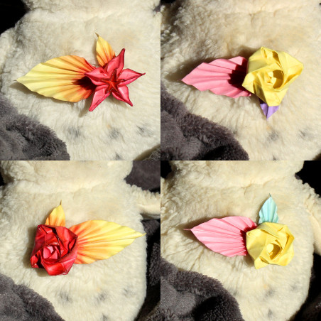 Broches ornées de fleurs et feuilles en origami pliées, éventuellement colorées, et vernies à la main.
